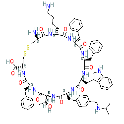 | SMILES | CC(C)NCc1ccc(C[C@@H]2NC(=O)[C@H](Cc3c[nH]c4ccccc34)NC(=O)[C@H](Cc3ccccc3)NC(=O)[C@@H](Cc3ccccc3)NC(=O)[C@@H](CCCCN)NC(=O)[C@H](N)CSSC[C@@H](C(=O)O)NC(=O)[C@H](Cc3ccccc3)NC(=O)[C@@H]([C@@H](C)O)NC2=O)cc1 |