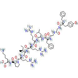 | SMILES | CC[C@H](C)[C@H](NC(=O)[C@H](CCCNC(=N)N)NC(=O)[C@H](CCCNC(=N)N)NC(=O)[C@H](CC(C)C)NC(=O)[C@H](Cc1ccccc1)NC(=O)CNC(=O)CNC(=O)[C@H](Cc1ccc(O)cc1)NCc1ccccc1)C(=O)N[C@@H](CCCNC(=N)N)C(=O)N1CCC[C@H]1C(=O)N[C@@H](CCCCN)C(=O)O |
