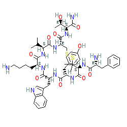 | SMILES | CC(C)[C@@H]1NC(=O)[C@H](CCCCN)NC(=O)[C@@H](Cc2c[nH]c3ccccc23)NC(=O)[C@H](Cc2ccc(O)cc2)NC(=O)[C@H](NC(=O)[C@H](N)Cc2ccccc2)C(C)(C)SSC[C@@H](C(=O)N[C@H](C(N)=O)[C@@H](C)O)NC1=O |