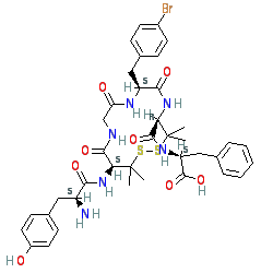 | SMILES | CC1(C)SSC(C)(C)[C@@H](C(=O)N[C@@H](Cc2ccccc2)C(=O)O)NC(=O)[C@H](Cc2ccc(Br)cc2)NC(=O)CNC(=O)[C@@H]1NC(=O)[C@@H](N)Cc1ccc(O)cc1 |