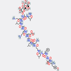 | SMILES | CC(C)C[C@H](NC(=O)[C@H](CO[C@@H]1O[C@H](CO)[C@@H](O[C@@H]2O[C@H](CO)[C@@H](O)[C@H](O)[C@H]2O)[C@H](O)[C@H]1O)NC(=O)[C@H](CCCCN)NC(=O)[C@H](CC(C)C)NC(=O)[C@H](C)NC(=O)[C@H](CCCCN)NC(=O)[C@H](CCC(=O)O)NC(=O)C(C)(C)NC(=O)[C@H](CC(C)C)NC(=O)[C@H](CC(N)=O)NC(=O)CCCNC(=O)[C@H](CC(C)C)NC(=O)[C@H](Cc1ccccc1)NC(=O)CNC(=O)[C@@H](NC(=O)[C@@H](N)Cc1ccc(O)cc1)[C@@H](C)O)C(N)=O |