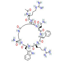 | SMILES | CC(=O)N[C@@H](CCCNC(=N)N)C(=O)N[C@H]1CCCC(=O)NCC[C@@H](C(N)=O)NC(=O)[C@H](Cc2c[nH]c3ccccc23)NC(=O)[C@H](CCCNC(=N)N)NC(=O)[C@@H](Cc2ccccc2)NC(=O)[C@H](CC(N)=O)NC1=O |