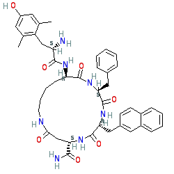 | SMILES | Cc1cc(O)cc(C)c1C[C@H](N)C(=O)N[C@@H]1CCCCNC(=O)C[C@@H](C(N)=O)NC(=O)[C@@H](Cc2ccc3ccccc3c2)NC(=O)[C@H](Cc2ccccc2)NC1=O |