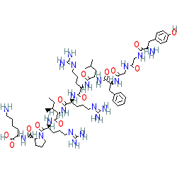 | SMILES | CC[C@H](C)[C@H](NC(=O)[C@H](CCCN=C(N)N)NC(=O)[C@H](CCCN=C(N)N)NC(=O)[C@H](CC(C)C)NC(=O)[C@H](Cc1ccccc1)NC(=O)CNC(=O)CNC(=O)[C@@H](N)Cc1ccc(O)cc1)C(=O)N[C@@H](CCCN=C(N)N)C(=O)N1CCC[C@@H]1C(=O)N[C@@H](CCCCN)C(=O)O |