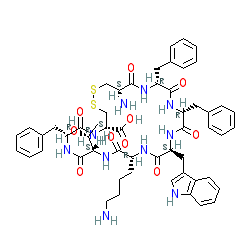 | SMILES | C[C@@H](O)[C@@H]1NC(=O)[C@@H](CCCCN)NC(=O)[C@H](Cc2c[nH]c3ccccc23)NC(=O)[C@@H](Cc2ccccc2)NC(=O)[C@@H](Cc2ccccc2)NC(=O)[C@H](N)CSSC[C@H](C(=O)O)NC(=O)[C@@H](Cc2ccccc2)NC1=O |