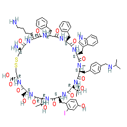| SMILES | CC(C)NCc1ccc(C[C@H]2C(=O)N[C@H]([C@@H](C)O)C(=O)N[C@@H](Cc3ccc(O)cc3I)C(=O)N[C@H]([C@@H](C)O)C(=O)N[C@@H](CO)C(=O)N[C@H](C(=O)O)CSSC[C@@H](N)C(=O)N[C@H](CCCCN)C(=O)N[C@H](Cc3ccccc3)C(=O)N[C@@H](Cc3ccccc3)C(=O)N[C@@H](Cc3c[nH]c4ccccc34)C(=O)N2C)cc1 |