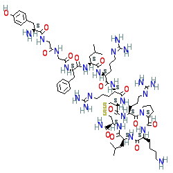 | SMILES | CC(C)C[C@@H]1NC(=O)[C@H](CCCCN)NC(=O)[C@@H]2CCCN2C(=O)[C@H](CCCN=C(N)N)NC(=O)[C@H](NC(=O)[C@H](CCCN=C(N)N)NC(=O)[C@H](CCCN=C(N)N)NC(=O)[C@H](CC(C)C)NC(=O)[C@H](Cc2ccccc2)NC(=O)CNC(=O)CNC(=O)[C@@H](N)Cc2ccc(O)cc2)CSSC[C@H](C(N)=O)NC1=O |