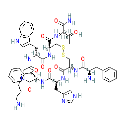 | SMILES | C[C@@H](O)[C@H](NC(=O)[C@H]1CSSC[C@H](NC(=O)[C@H](N)Cc2ccccc2)C(=O)N[C@@H](Cc2c[nH]cn2)C(=O)N[C@@H](Cc2ccccc2)C(=O)N(CCCN)CC(=O)N[C@H](Cc2c[nH]c3ccccc23)C(=O)N1)C(N)=O |