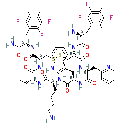 | SMILES | CC(C)[C@H]1NC(=O)[C@H](CCCCN)NC(=O)[C@@H](Cc2c[nH]c3ccccc23)NC(=O)[C@H](Cc2ccccn2)NC(=O)[C@@H](NC(=O)[C@@H](N)Cc2c(F)c(F)c(F)c(F)c2F)CSSC[C@H](C(=O)N[C@@H](Cc2c(F)c(F)c(F)c(F)c2F)C(N)=O)NC1=O |