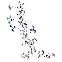 | SMILES | CC[C@H](C)[C@H](NC(=O)[C@H](CCCN=C(N)N)NC(=O)[C@H](CCCN=C(N)N)NC(=O)[C@H](CC(C)C)NC(=O)[C@H](Cc1ccccc1)NC(=O)[C@@H](Cc1c[nH]c2ccccc12)NC(=O)CNC(=O)[C@@H](N)Cc1ccc(O)cc1)C(=O)N[C@@H](CCCN=C(N)N)C(=O)N1CCC[C@H]1C(=O)N[C@@H](CCCCN)C(N)=O |