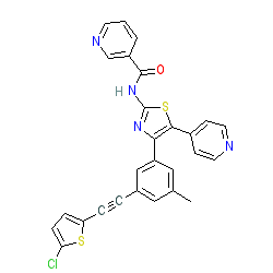 | SMILES | Cc1cc(C#Cc2ccc(Cl)s2)cc(-c2nc(NC(=O)c3cccnc3)sc2-c2ccncc2)c1 |