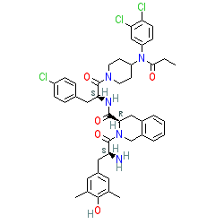 | SMILES | CCC(=O)N(c1ccc(Cl)c(Cl)c1)C1CCN(C(=O)[C@H](Cc2ccc(Cl)cc2)NC(=O)[C@H]2Cc3ccccc3CN2C(=O)[C@@H](N)Cc2cc(C)c(O)c(C)c2)CC1 |