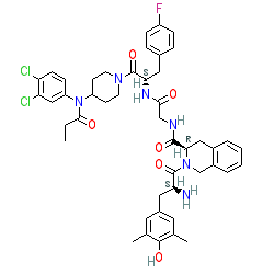 | SMILES | CCC(=O)N(c1ccc(Cl)c(Cl)c1)C1CCN(C(=O)[C@H](Cc2ccc(F)cc2)NC(=O)CNC(=O)[C@H]2Cc3ccccc3CN2C(=O)[C@@H](N)Cc2cc(C)c(O)c(C)c2)CC1 |