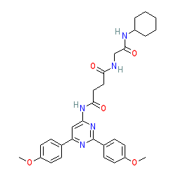 | SMILES | COc1ccc(-c2cc(NC(=O)CCC(=O)NCC(=O)NC3CCCCC3)nc(-c3ccc(OC)cc3)n2)cc1 |