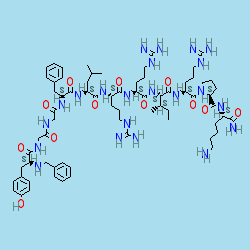 | SMILES | CC[C@H](C)[C@H](NC(=O)[C@H](CCCNC(=N)N)NC(=O)[C@H](CCCNC(=N)N)NC(=O)[C@H](CC(C)C)NC(=O)[C@H](Cc1ccccc1)NC(=O)CNC(=O)CNC(=O)[C@H](Cc1ccc(O)cc1)NCc1ccccc1)C(=O)N[C@@H](CCCNC(=N)N)C(=O)N1CCC[C@H]1C(=O)N[C@@H](CCCCN)C(N)=O |