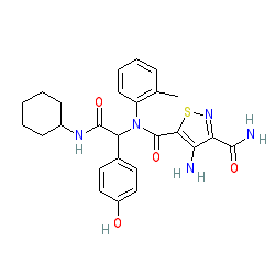 | SMILES | Cc1ccccc1N(C(=O)c1snc(C(N)=O)c1N)C(C(=O)NC1CCCCC1)c1ccc(O)cc1 |