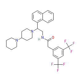 | SMILES | O=C(Cc1cc(C(F)(F)F)cc(C(F)(F)F)c1)NCC(c1cccc2ccccc12)N1CCC(N2CCCCC2)CC1 |