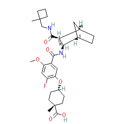 | SMILES | COC1=CC(F)=C(O[C@H]2CC[C@](C(O)=O)(C)CC2)C=C1C(N[C@H]3[C@@H](C(NCC4(CCC4)C)=O)[C@@H]5CC[C@H]3C5)=O |