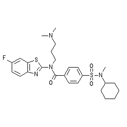 | SMILES | CN(C)CCCN(C(=O)c1ccc(S(=O)(=O)N(C)C2CCCCC2)cc1)c1nc2ccc(F)cc2s1 |