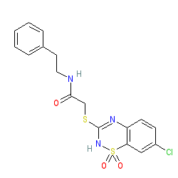 | SMILES | O=C(CSC1=Nc2ccc(Cl)cc2S(=O)(=O)N1)NCCc1ccccc1 |