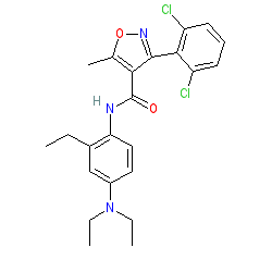 | SMILES | CCc1cc(N(CC)CC)ccc1NC(=O)c1c(-c2c(Cl)cccc2Cl)noc1C |