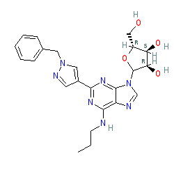| SMILES | CCCNc1nc(-c2cnn(Cc3ccccc3)c2)nc2c1ncn2C1O[C@H](CO)[C@@H](O)[C@H]1O |