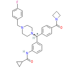 | SMILES | O=C(Nc1cccc([C@@H](c2ccc(C(=O)N3CCC3)cc2)N2CCN(Cc3ccc(F)cc3)CC2)c1)C1CC1 |
