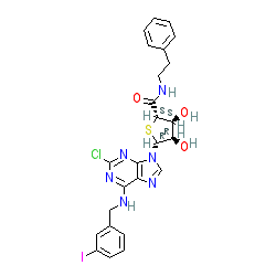 | SMILES | O=C(NCCc1ccccc1)[C@H]1S[C@@H](n2cnc3c(NCc4cccc(I)c4)nc(Cl)nc32)[C@H](O)[C@@H]1O |