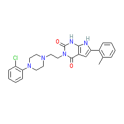 | SMILES | Cc1ccccc1-c1cc2c(=O)n(CCN3CCN(c4ccccc4Cl)CC3)c(=O)[nH]c2[nH]1 |