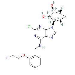| SMILES | O[C@@H]1[C@H](O)[C@@H]2C[C@@H]2[C@H]1n1cnc2c(NCc3ccccc3OCCF)nc(Cl)nc21 |