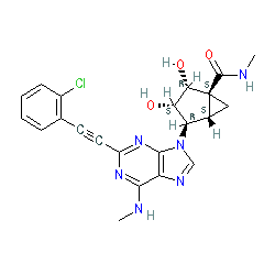 | SMILES | CNC(=O)[C@@]12C[C@@H]1[C@@H](n1cnc3c(NC)nc(C#Cc4ccccc4Cl)nc31)[C@H](O)[C@@H]2O |
