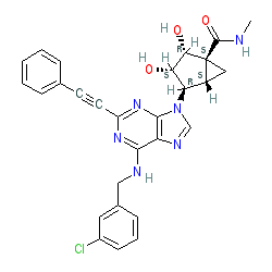 | SMILES | CNC(=O)[C@@]12C[C@@H]1[C@@H](n1cnc3c(NCc4cccc(Cl)c4)nc(C#Cc4ccccc4)nc31)[C@H](O)[C@@H]2O |