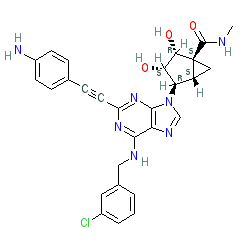 | SMILES | CNC(=O)[C@@]12C[C@@H]1[C@@H](n1cnc3c(NCc4cccc(Cl)c4)nc(C#Cc4ccc(N)cc4)nc31)[C@H](O)[C@@H]2O |