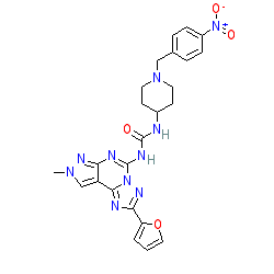 | SMILES | Cn1cc2c(nc(NC(=O)NC3CCN(Cc4ccc([N+](=O)[O-])cc4)CC3)n3nc(-c4ccco4)nc23)n1 |