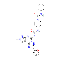 | SMILES | Cn1cc2c(nc(NC(=O)NC3CCN(C(=O)NC4CCCCC4)CC3)n3nc(-c4ccco4)nc23)n1 |