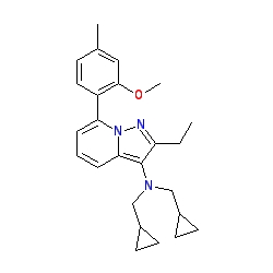 | SMILES | CCc1nn2c(-c3ccc(C)cc3OC)cccc2c1N(CC1CC1)CC1CC1 |