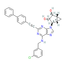 | SMILES | O[C@@H]1[C@H](O)[C@@H]2C[C@@H]2[C@H]1n1cnc2c(NCc3cccc(Cl)c3)nc(C#Cc3ccc(-c4ccccc4)cc3)nc21 |
