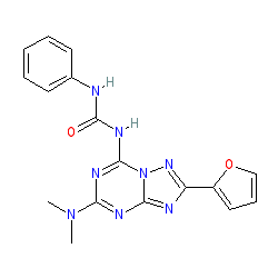 | SMILES | CN(C)c1nc(NC(=O)Nc2ccccc2)n2nc(-c3ccco3)nc2n1 |