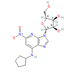 | SMILES | O=[N+]([O-])c1cc(NC2CCCC2)c2ncn([C@@H]3O[C@H](CO)[C@@H](O)[C@H]3O)c2n1 |