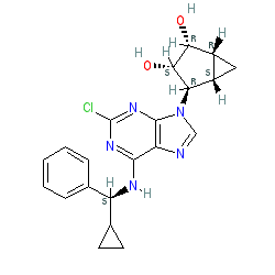 | SMILES | O[C@@H]1[C@H](O)[C@@H]2C[C@@H]2[C@H]1n1cnc2c(N[C@H](c3ccccc3)C3CC3)nc(Cl)nc21 |