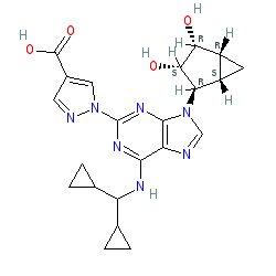 | SMILES | O=C(O)c1cnn(-c2nc(NC(C3CC3)C3CC3)c3ncn([C@H]4[C@H](O)[C@H](O)[C@@H]5C[C@@H]54)c3n2)c1 |