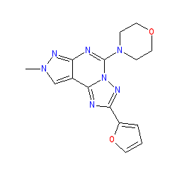 | SMILES | Cn1cc2c(nc(N3CCOCC3)n3nc(-c4ccco4)nc23)n1 |
