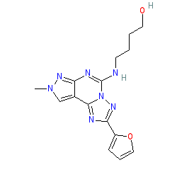 | SMILES | Cn1cc2c(nc(NCCCCO)n3nc(-c4ccco4)nc23)n1 |