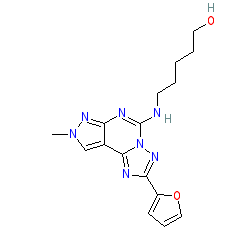 | SMILES | Cn1cc2c(nc(NCCCCCO)n3nc(-c4ccco4)nc23)n1 |