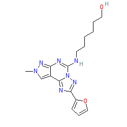 | SMILES | Cn1cc2c(nc(NCCCCCCO)n3nc(-c4ccco4)nc23)n1 |