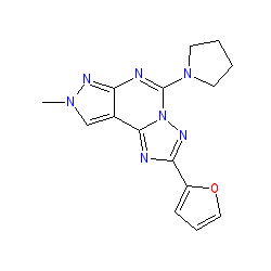 | SMILES | Cn1cc2c(nc(N3CCCC3)n3nc(-c4ccco4)nc23)n1 |