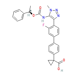 | SMILES | C[C@@H](OC(=O)Nc1c(-c2ccc(-c3ccc(C4(C(=O)O)CC4)cc3)cc2F)nnn1C)c1ccccc1 |