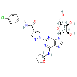 | SMILES | O=C(NCc1ccc(Cl)cc1)c1cnn(-c2nc(N[C@H]3CCCO3)c3ncn([C@@H]4O[C@H](CO)[C@@H](O)[C@H]4O)c3n2)c1 |