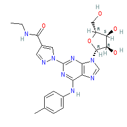 | SMILES | CCNC(=O)c1cnn(-c2nc(Nc3ccc(C)cc3)c3ncn([C@@H]4O[C@H](CO)[C@@H](O)[C@H]4O)c3n2)c1 |