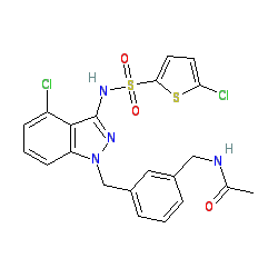 | SMILES | CC(=O)NCc1cccc(Cn2nc(NS(=O)(=O)c3ccc(Cl)s3)c3c(Cl)cccc32)c1 |